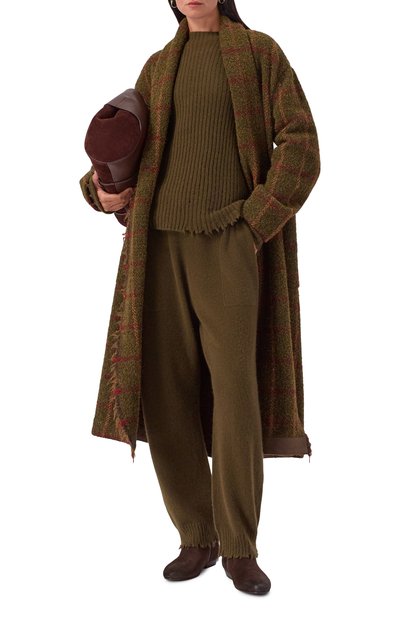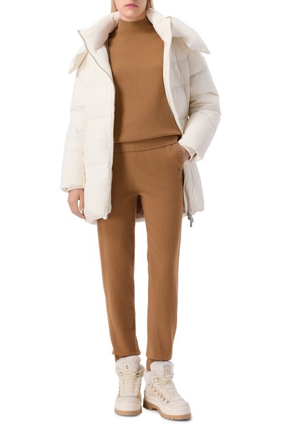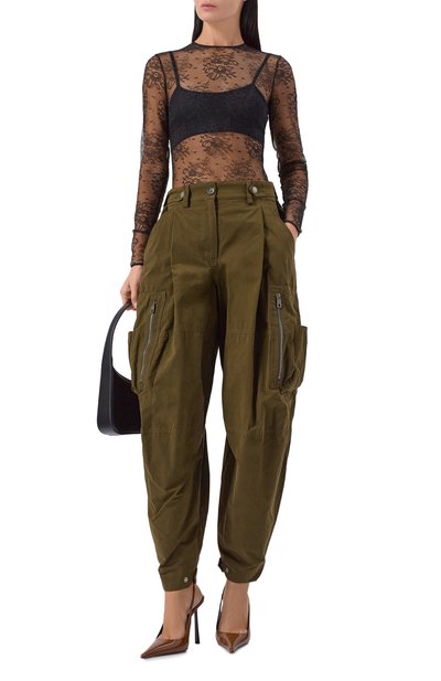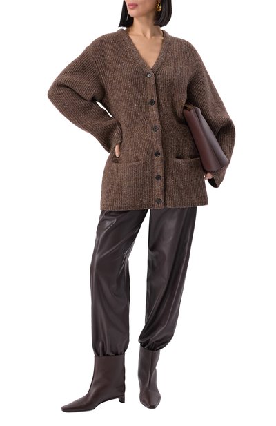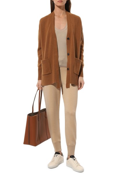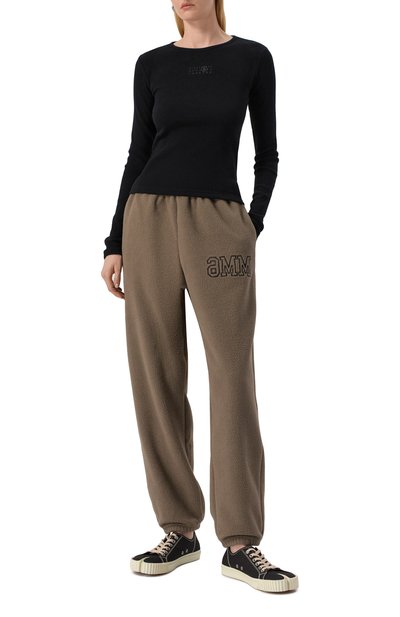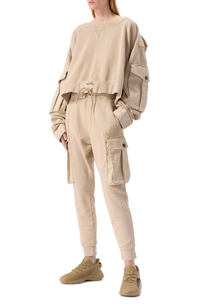Для пошива джоггеров с широким поясом-кулиской и манжетами в рубчик использовали хлопковый флис. Укороченные брюки дополнили тремя парами карманов.