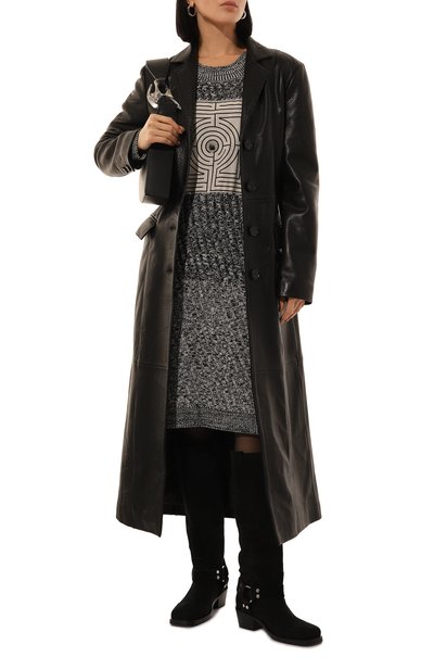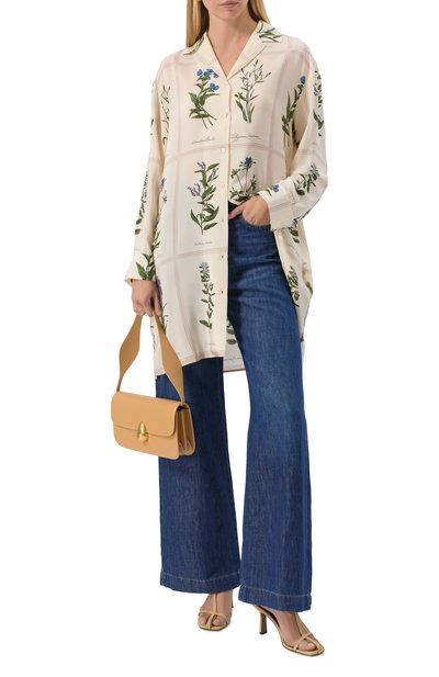 Платье-свитшот со спущенной линией плеч сшили из хлопкового футера с красочным принтом. Модель свободного кроя дополнили манжетами и поясом в рубчик.