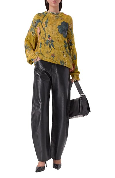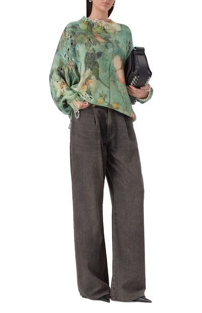 Oversize-свитер, связанный из хлопка, украсили принтом и множеством спущенных петель, придающих изделию состаренный вид. Модель органично дополнит непринужденный образ.
