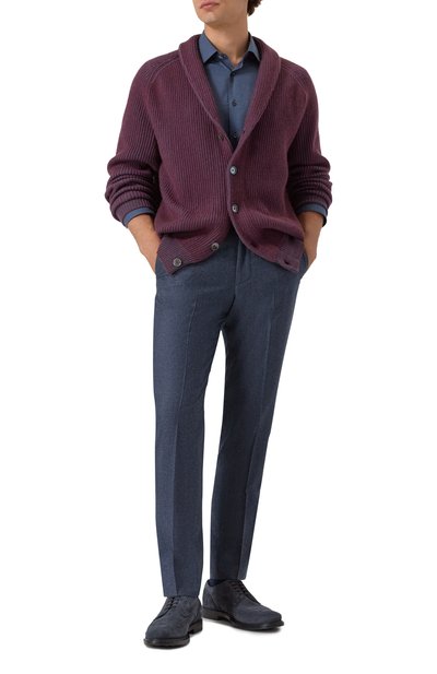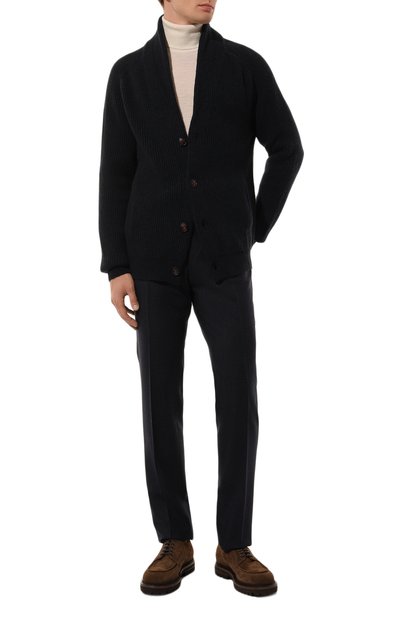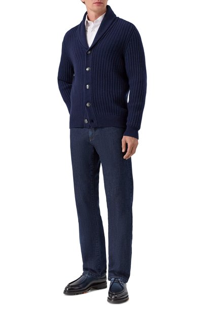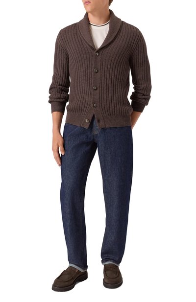 Кардиган с шалевым воротником связали из кашемировой пряжи Feather. Модель застегивается металлическими брендированными пуговицами. Манжеты, пояс и отделка двух накладных карманов вып олнены резинкой.