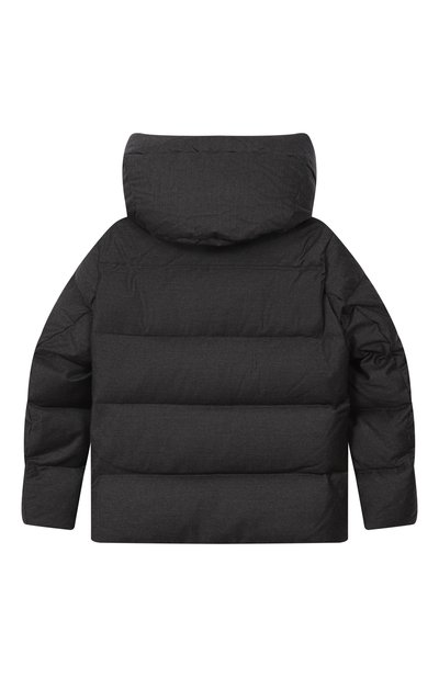 Стеганую куртку на гусином пуху выполнили из шерстяного вельвета с добавлением кашемира и шелка. Модель с рукавами реглан и воротником-стойкой дополнили боковыми карманами. Пуховик украсили на шивкой Monumental.