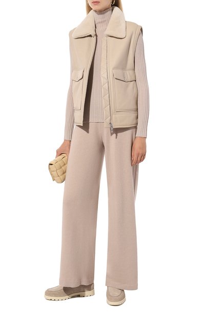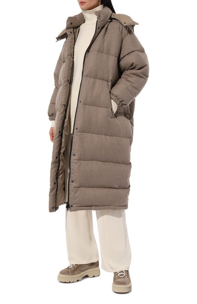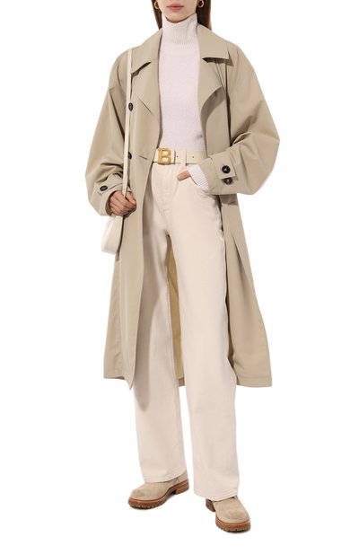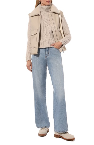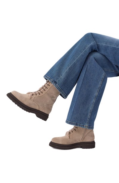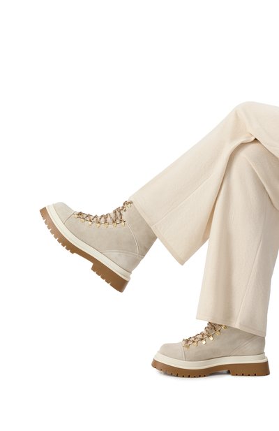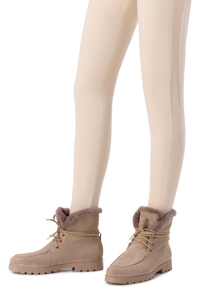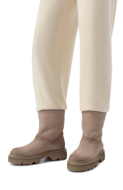 Замшевые высокие ботинки с внутренней и внешней отделкой из овчины украсили брендированной нашивкой на язычке и стежком фирменного оранжевого оттенка на голенище сзади. Модель с усиленной шнуровкой установили на массивную подошву с протектором.