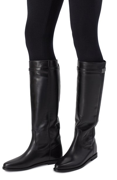 Сапоги на низком квадратном каблуке, частично окрашенным в фирменный оттенок Arancio Santoni, выполнили из гладкой кожи. Внешнюю боковую сторону модели дополнили ремешком с фирменной пряжкой, а внутреннюю – короткой молнией.
