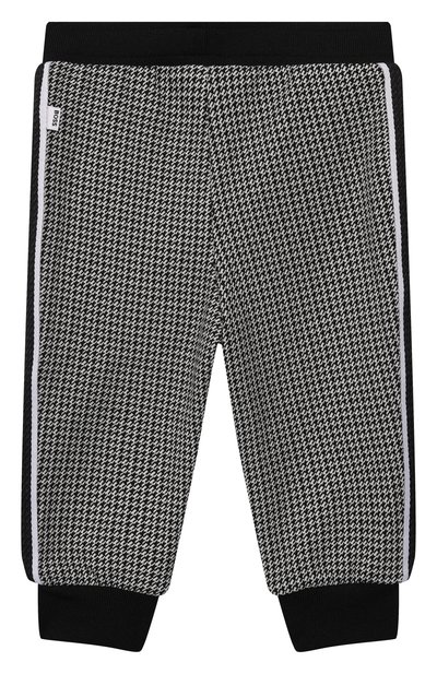 Джоггеры свободного кроя выполнили из стрейчевого полиэстерового трикотажа в клетку пье-де-пуль. Модель с широким поясом в рубчик декорировали полосатыми лампасами и фирменной этикеткой в боковом шве.