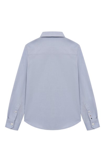 Рубашку с закругленной линией низа выполнили из хлопка. Спереди модель украсили контрастным вышитым логотипом марки, которому вторит фирменный триколор на правой манжете.