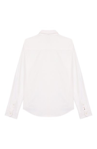 Рубашку с кокеткой на спинке и отложным воротником выполнили из хлопковой ткани. Спереди модель декорировали вышитым логотипом, а возле одной из скошенных манжет – фирменным триколором.