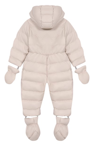 Стеганый комбинезон с подкладом из искусственного меха и синтетическим утеплителем выполнили из полиэстера. Модель с капюшоном, эластичными манжетами и двумя молниями с кантом в цветах фирменного триколора дополнили съемными варежками и пинетками.