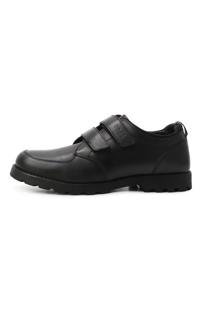 Дерби на протекторной подошве выполнили из гладкой кожи. Пару с текстильной внутренней отделкой и петлей с фирменным триколором на заднике украсили тисненым логотипом на одном из двух ремешком велкро.