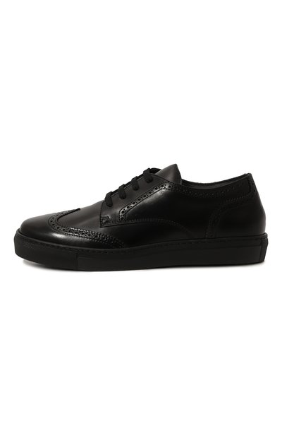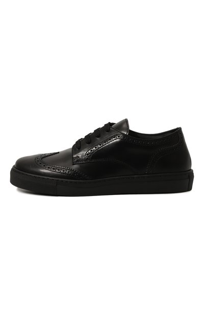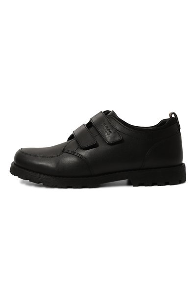 Дерби на протекторной подошве выполнили из гладкой кожи. Пару с текстильной внутренней отделкой и петлей с фирменным триколором на заднике украсили тисненым логотипом на одном из двух ремешком велкро.