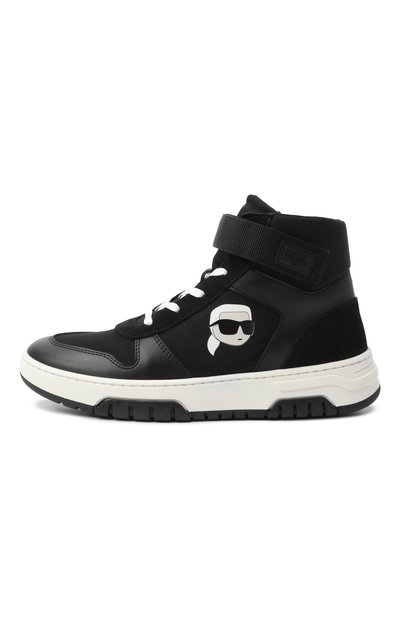 Высокие кеды с аппликацией Ikon Karl выполнили из текстиля и кожи. Модель со шнуровкой и брендированным ремешком велкро дополнили боковой молнией.