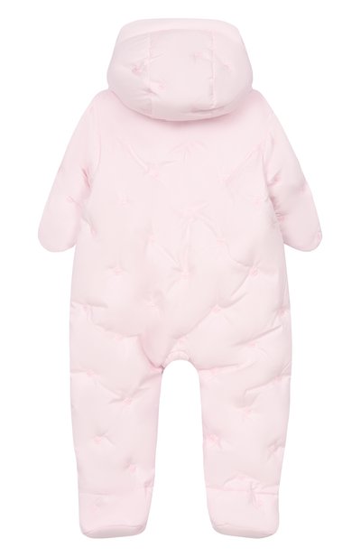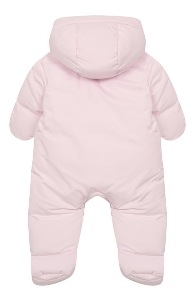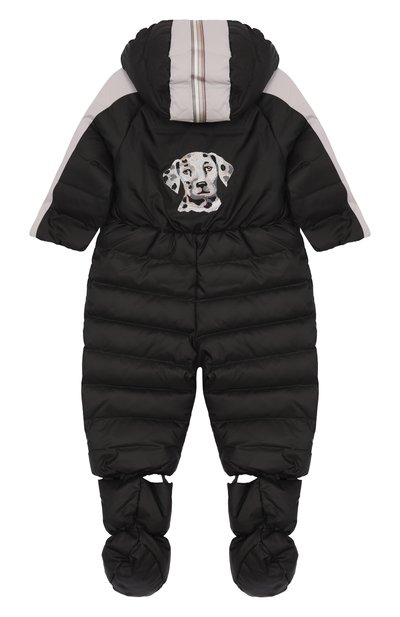 Стеганый комбинезон с капюшоном и эластичными манжетами сшили из матового полиамида с фирменным паттерном. Утепленная модель с контрастным логотипом марки застегивается двумя молниями.