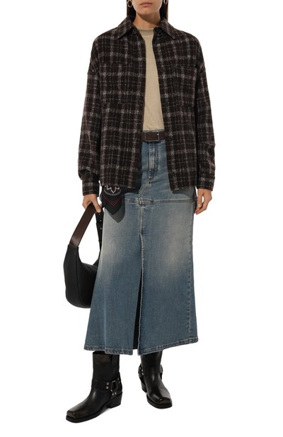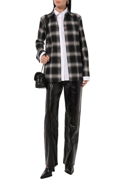 Короткую рубашку с закругленной линией низа спереди выполнили из клетчатого хлопка. Модель на пуговицах дополнили нагрудным накладным карманом.