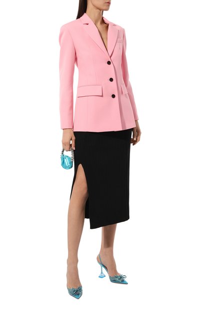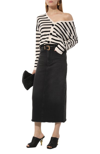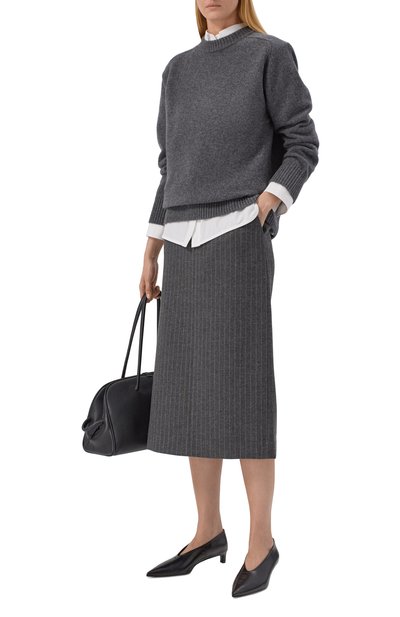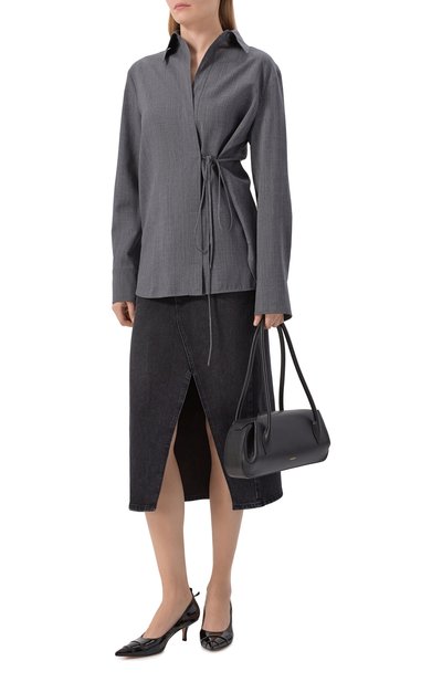 Миди-юбку с клетчатым микроузором выполнили из чуть ворсистой ткани на основе полиэстера и шерсти. Модель прямого кроя дополнили шелковистым подкладом, высокой шлицей и двумя парами карманов.
