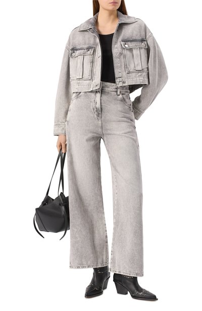 Утепленный бомбер с манжетами, поясом и воротником-стойкой из трикотажа в рубчик выполнили из буклированной шерсти. Куртку с кожаной отделкой на боковых карманах и окатах декорировали металлической эмблемой спереди.