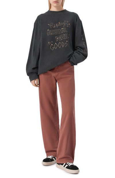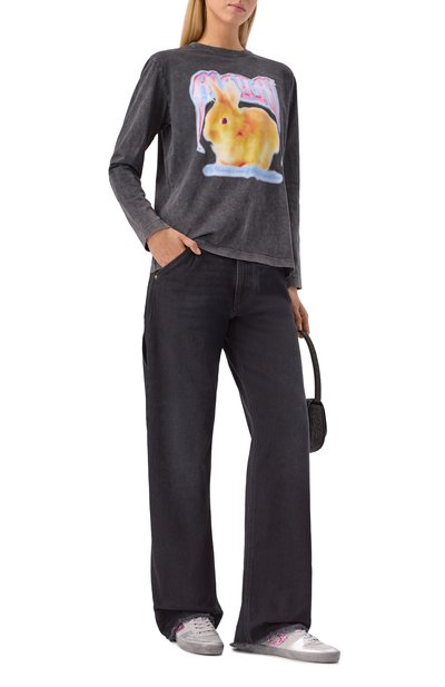 Двухслойный лонгслив выполнили из джерси на основе вискозы, окрашенного в контрастные оттенки. На принадлежность модели марке указали небольшим брендированным патчем на спинке.