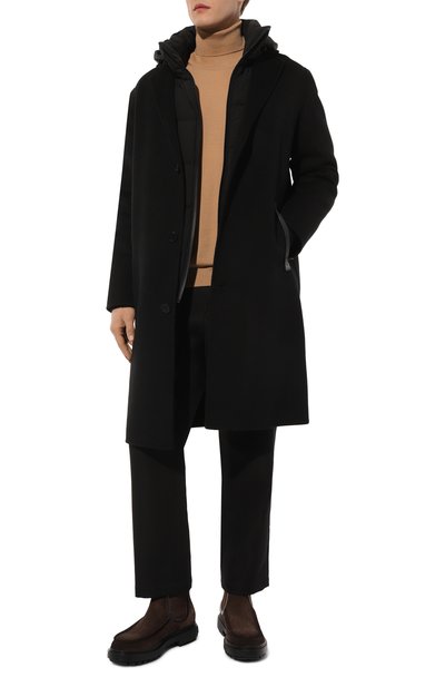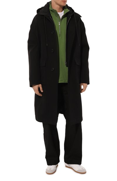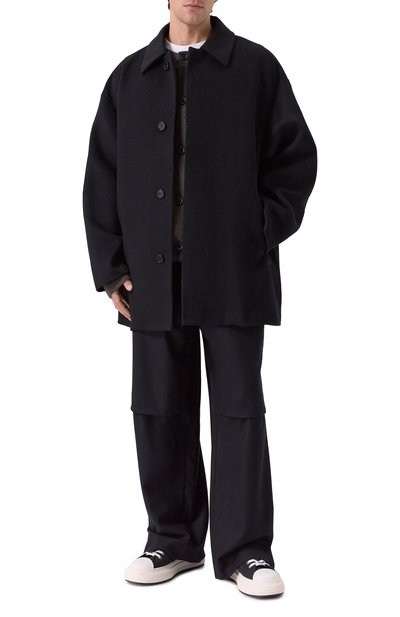 Oversize-пальто на потайных пуговицах выполнили из микса шерсти и кашемира. Модель со спущенной линией плеч, отложным воротником и двумя карманами по бокам дополнили съемным нагрудником с регулируемым капюшоном.