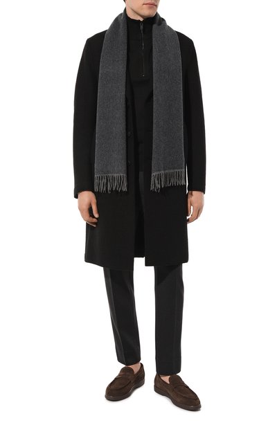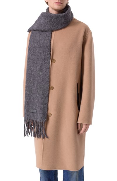 Широкий шарф с ворсистой фактурой выполнили из чистого кашемира. Концы аксессуара с брендированной этикеткой подчеркнули бахромой.
