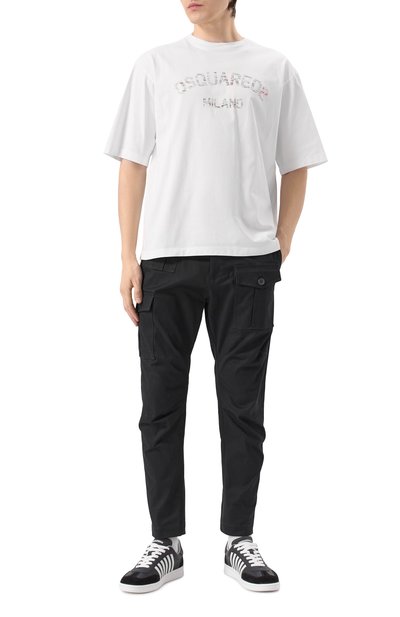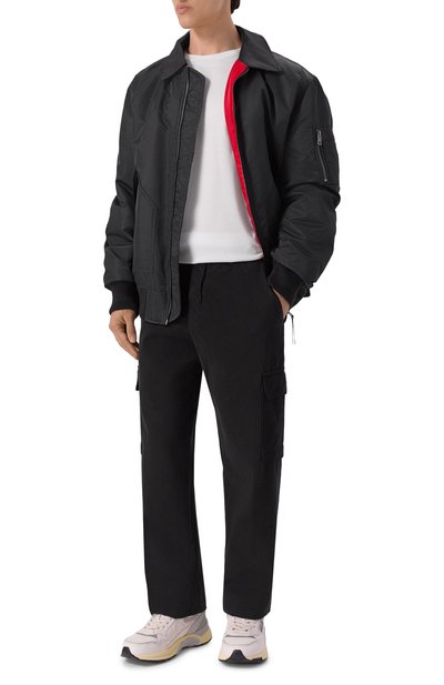 Брюки с поясом-кулиской сшили из хлопкового вельвета стрейч в крупный рубчик. Модель дополнена тремя парами карманов: крупными боковыми, задними и карго. Сзади внизу предусмотрели молнии, позволяющие регулировать ширину брючин.