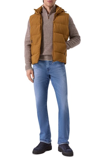 Oversize-жилет с разноцветным узором аргайл спереди связали из фактурной пряжи на основе шетландской шерсти. Модель со спущенными петлями на поясе в рубчик украсили фирменной пластиной сзади и вышитым нитью в тон логотипом на груди.