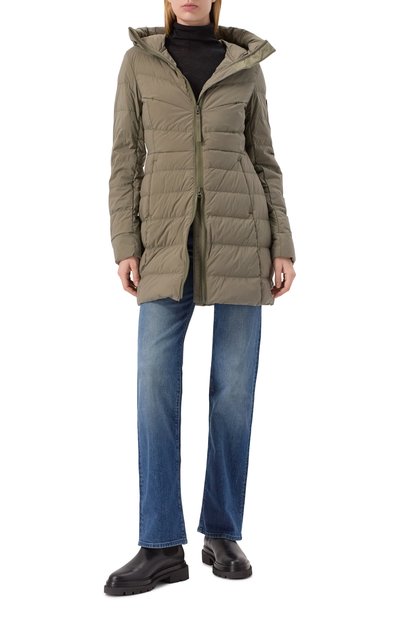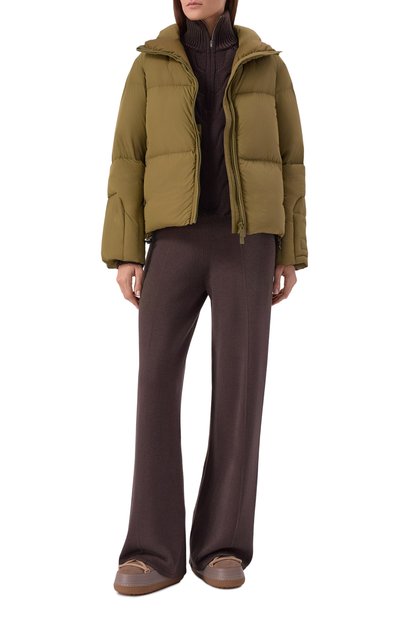 Стеганую куртку на гусином пуху выполнили из смеси хлопка и нейлона. Спереди расположили рельефный логотип бренда в тон. Модель с боковыми карманами и задний воротник с бархатной подкладкой застегиваются молнией.