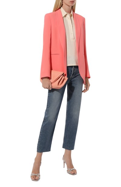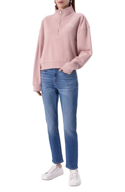 Расклешенные джинсы с пятью карманами выполнили из денима. Выбеленную модель с небольшими потертостями по краям украсили брендированным кожаным патчем сзади.