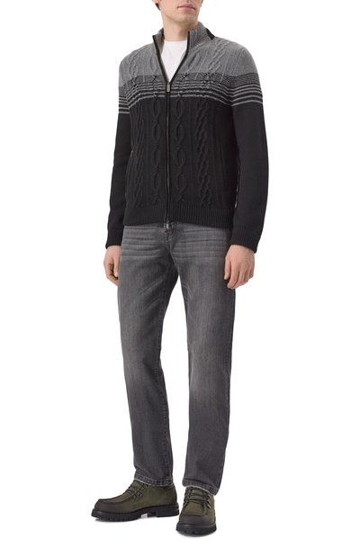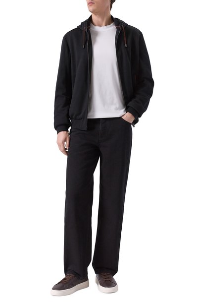 Толстовку с контрастной отделкой выполнили из шерстяного трикотажа. Модель с регулируемым капюшоном и боковыми карманами застегивается встречной молнией с фирменными пуллерами, которым вторит заклепка-октагон сбоку.