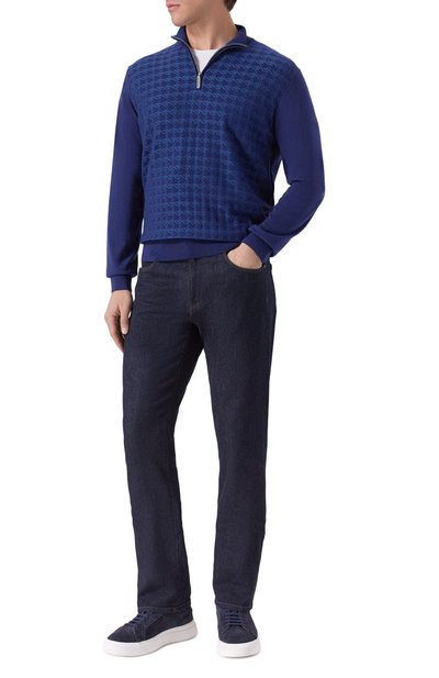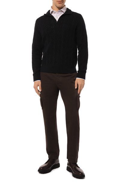 Джемпер с отделкой в рубчик выполнили из кашемировой пряжи. Модель с высоким воротом застегивается короткой молнией с фирменным пуллером-октагоном.