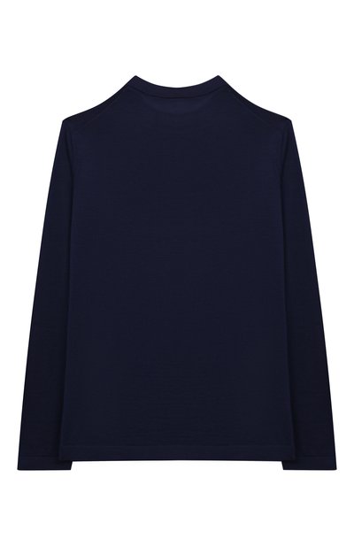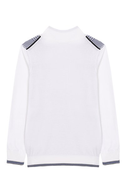 Пуловер с контрастным кантом вдоль рукавов и по низу связали гладким узором из тонкой шерстяной пряжи. Модель с высоким воротом дополнили супатной застежкой, декорированной логотипом марки.