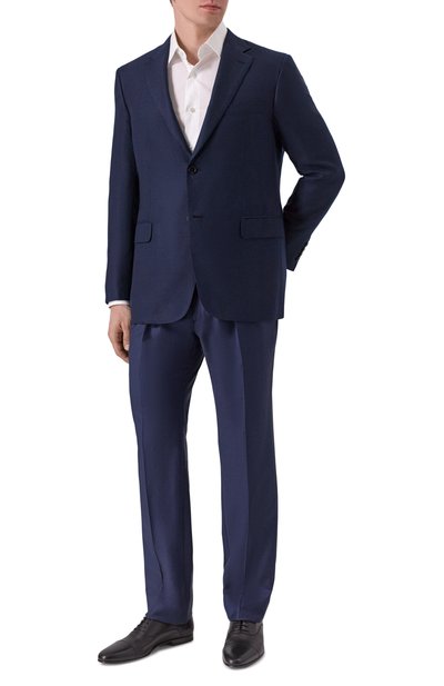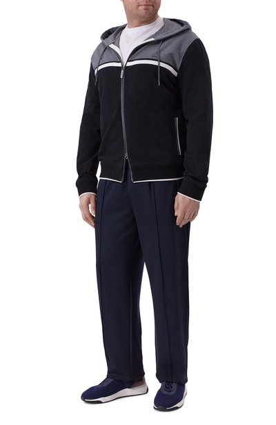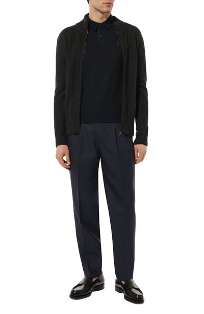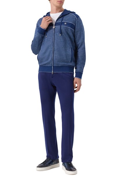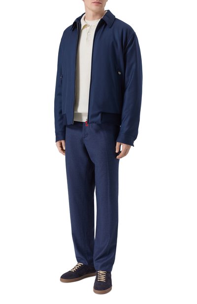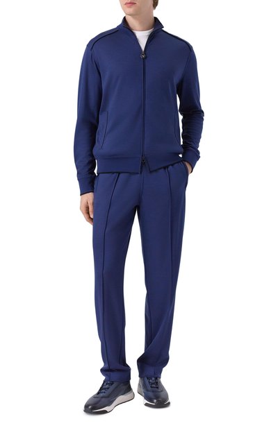 Брюки с прошитыми стрелками и поясом-кулиской в рубчик выполнили из шерстяного трикотажа. Один из трех карманов украсили вышитой эмблемой Royal Eagle.