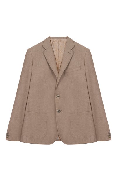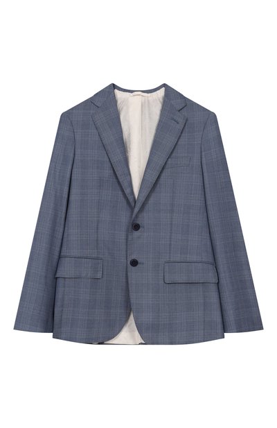 Костюм-двойку с клетчатым микроузором выполнили из ткани на основе шерсти, кашемира и хлопка. Однобортный пиджак с двумя шлицами дополнили боковыми карманами с клапанами, а брюки с регулируемым поясом-кулиской – боковыми и задними.