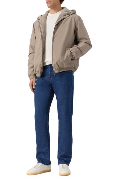 Бомбер из полиэстера, на подкладе из микса шерсти и шелка дополнили поясом, воротом и манжетами из трикотажа в рубчик. Модель с двумя карманами и регулируемым капюшоном застегивается встречной молнией с фирменными пуллерами, которым вторит заклепка сбоку.