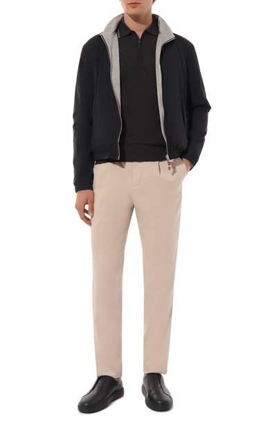 Бомбер из полиэстера, на подкладе из микса шерсти и шелка дополнили поясом, воротом и манжетами из трикотажа в рубчик. Модель с двумя карманами и регулируемым капюшоном застегивается встречной молнией с фирменными пуллерами, которым вторит заклепка сбоку.