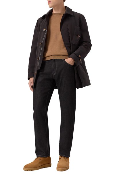 Плащ со шлицей сзади и съемным капюшоном застегивается молнией, скрытой под штормовой планкой с пуговицами. Для пошива модели на подкладе из кашемира и шелка использовали полиэстер. Один из двух карманов и спинку украсили фирменными пластинами.