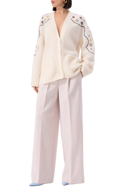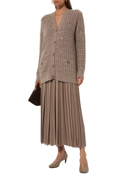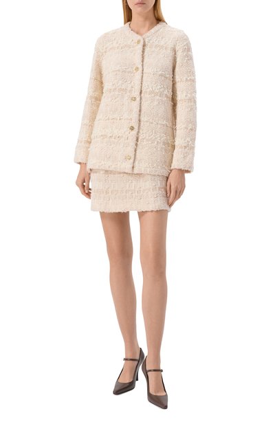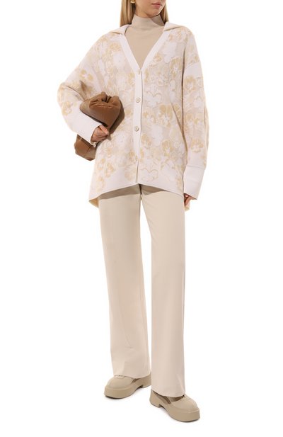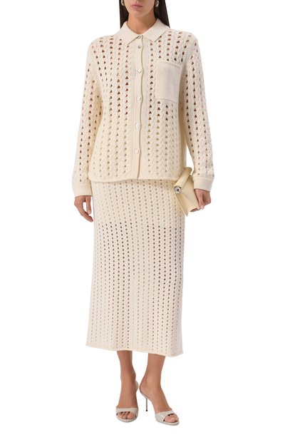 Укороченный кардиган выполнили неплотной ажурной вязкой из полушерстяной пряжи. Модель с круглой горловиной, поясом и манжетами в рубчик застегивается золотистыми пуговицами.