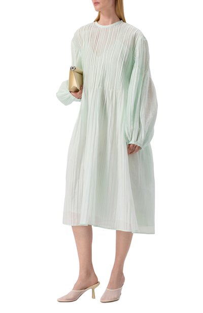 Платье с объемными рукавами и короткой супатной застежкой спереди дополнили шарфом на V-образной горловине с узкими лацканами. Модель выполнили их струящейся вискозы, заложив складки по линии талии.
