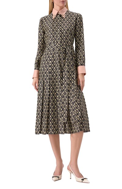 Для пошива платья со множеством складок использовали полупрозрачный шелк с графичным цветочным мотивом. Модель дополнили воротником аскот.