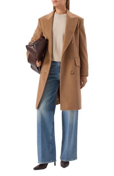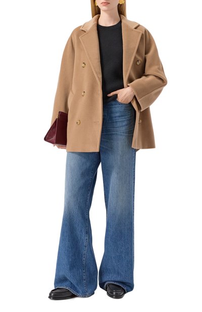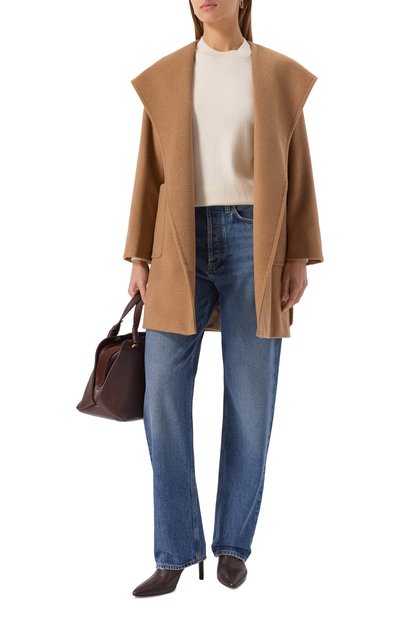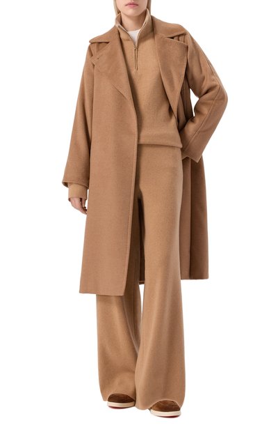 Пальто Berard с рукавами реглан и широкими лацканами выполнили из шерстяного драпа и вязаного полотна из микса шерсти и кашемира. Модель с двумя накладными карманами дополнили поясом, регулирующим глубину запаха.