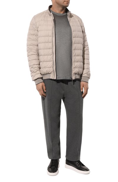 Бомбер с кокеткой из матовой кожи выполнили из разных по фактуре материалов. Утепленную модель с вязаными рукавами и подкладом из искусственного меха дополнили карманами по бокам. Куртка застегивается встречной молнией.