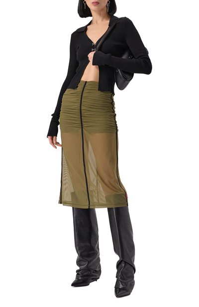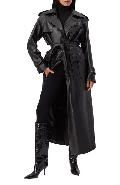 Высокие сапоги Vern на фирменной шпильке с основанием в виде головы волка выполнили из кожи. Под нарочито широким голенищем модели с зауженным мысом расположили заклепку-эмблему.