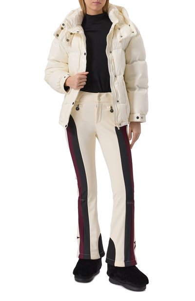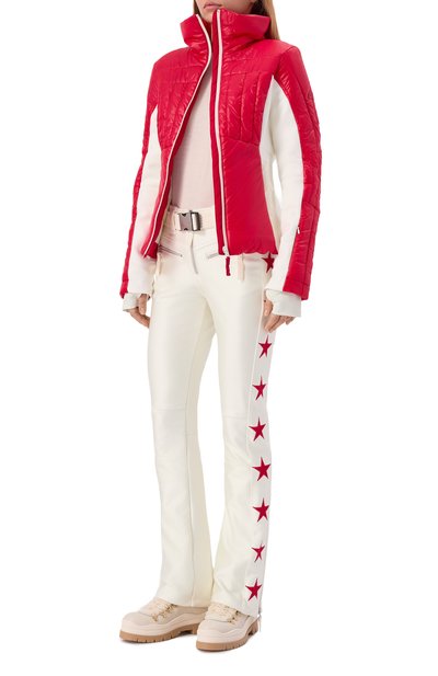 Расклешенные брюки Aurora с флисовой подкладкой выполнили из влагоотталкивающей эластичной ткани Toray Dermizax™ на основе нейлона. Спереди и сзади расположили фирменные звезды. Сама модель с высокой посадкой, внутренними снегозащитными гетрами и кнопками Riri на поясе, а также боковые карманы и брючины снизу застегиваются молниями.