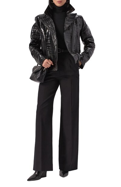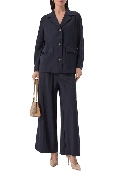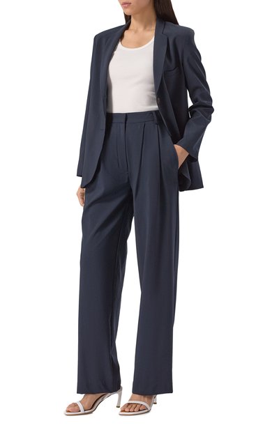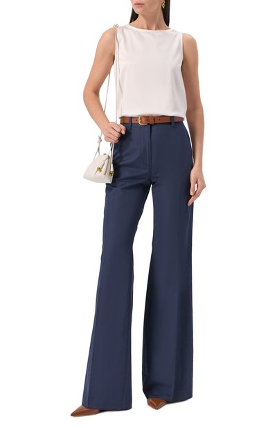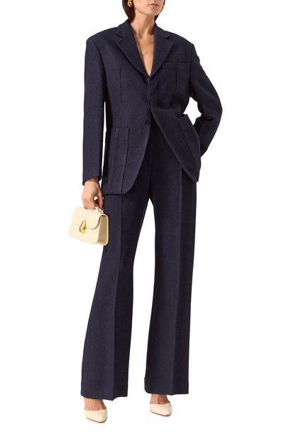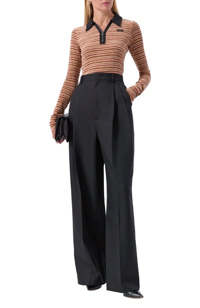 Широкие брюки со стрелками выполнили из вискозного канваса с добавлением шерсти. Модель с эластичным поясом дополнили двумя боковыми и парой задних карманов, один из которых украсили эмблемой марки в тон.