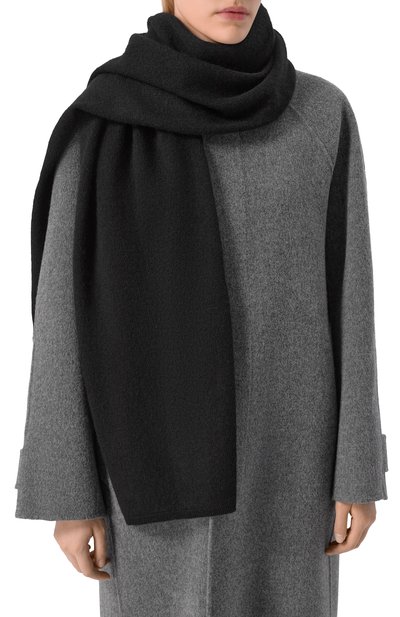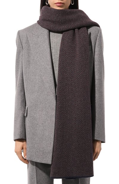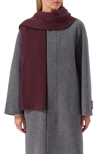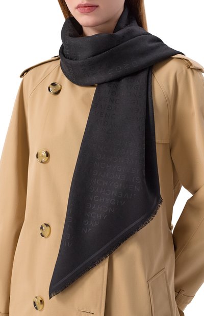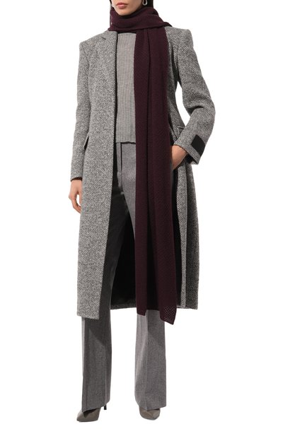 Шарф-косынку с оверлочными швами по краям выполнили из чистого кашемира. Аксессуар украсили логотипом бренда, вышитым в тон.