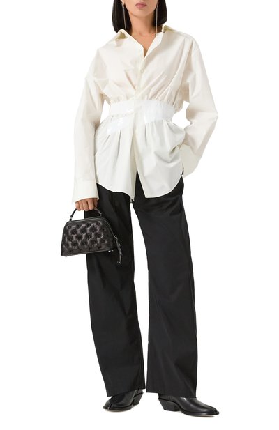 Широкие брюки с эластичным поясом и боковыми карманами выполнили из полиэстера с добавлением хлопка. Спереди неравномерно окрашенную модель с заломами декорировали логотипом марки.