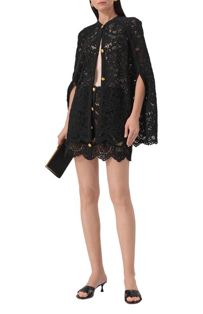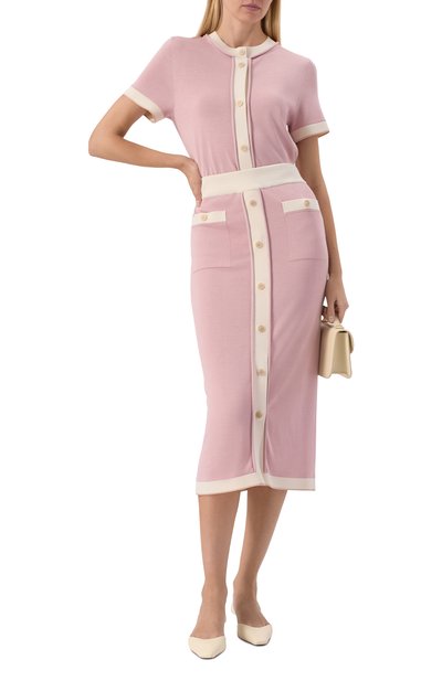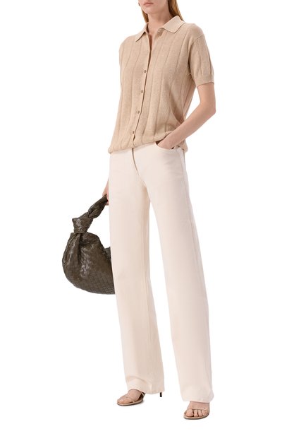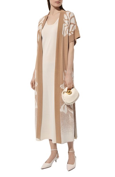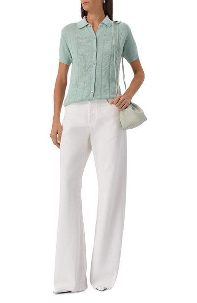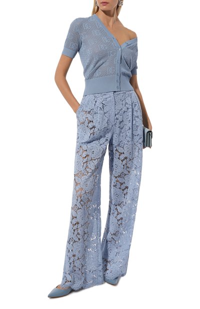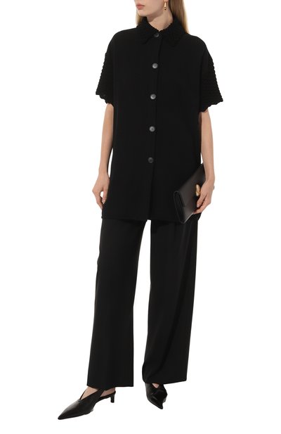 Кардиган с короткими рукавами и отложным воротником связали из шерстяной пряжи. Сбоку укороченную модель декорировали лентой с контрастным логотипом.