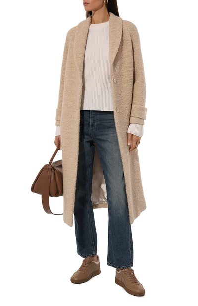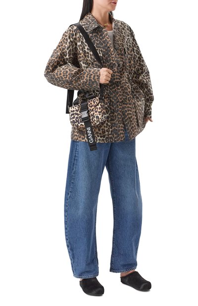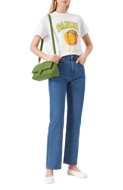 Джинсы с высокой посадкой сшили из эластичного хлопкового денима с добавлением полиэстера. Модель со стрелками и пятью карманами украсили брендированными патчами сзади.