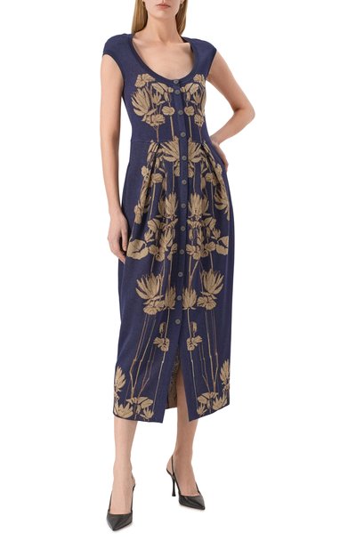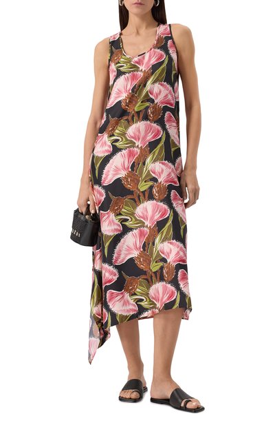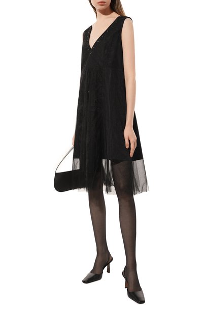 Для создания мини-платья с полупрозрачными вставками использовали полиэстер с цветочным узором и бахромой из распущенных нитей. Модель с круглой горловиной застегивается потайной молнией сзади.