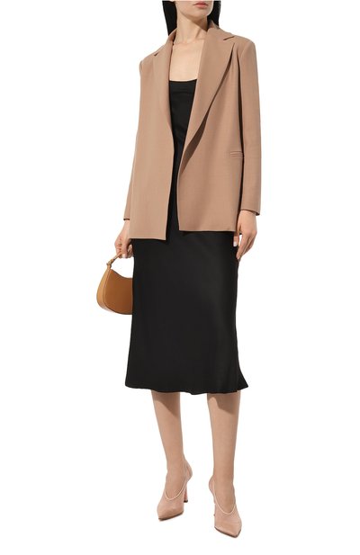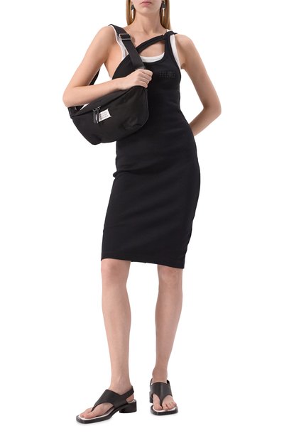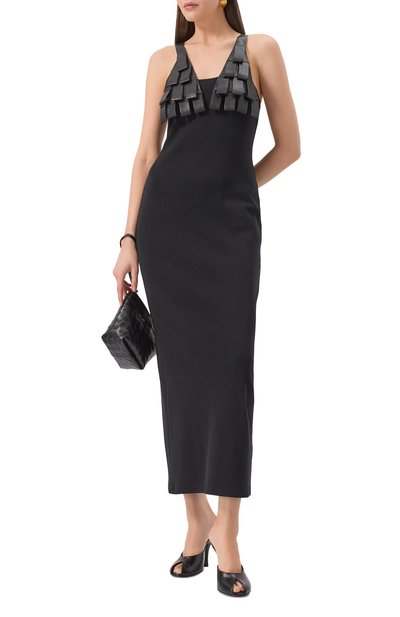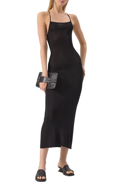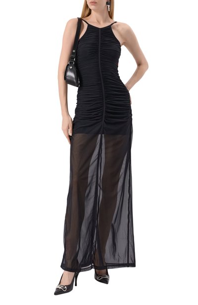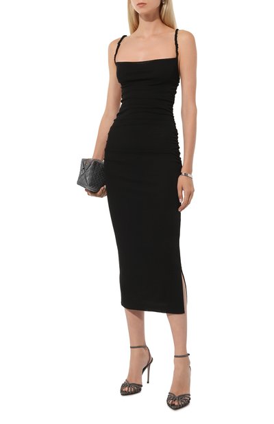 Для изготовления драпированного платья Alexa с узкими регулируемыми бретелями использовали сетчатое джерси на основе вторичного полиэстера. Сбоку облегающую модель дополнили разрезом.