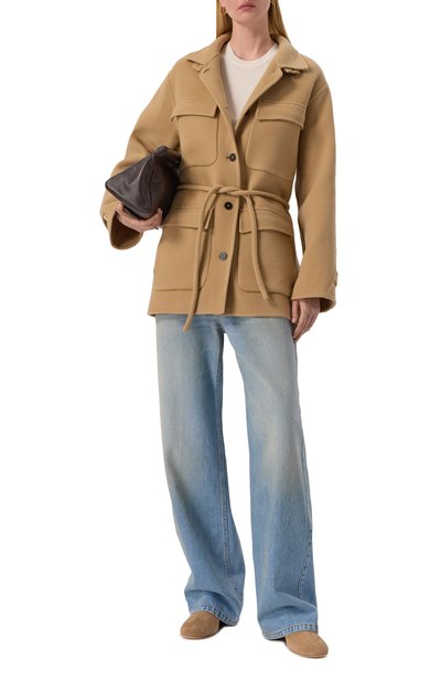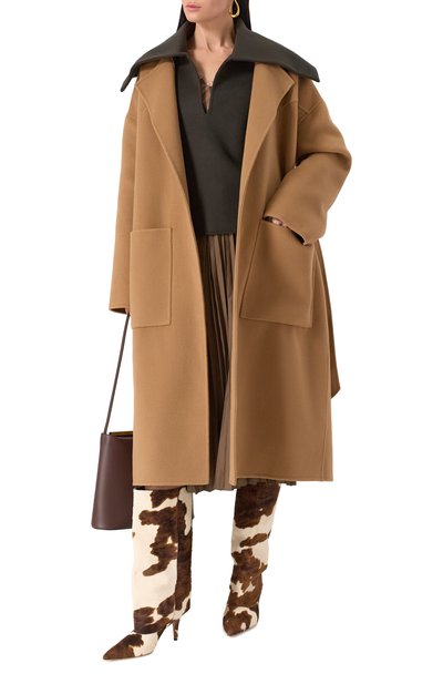 Пальто Alamo с широкими лацканами выполнили из ворсистой шерстяной ткани с добавлением шелка. Модель с длинной шлицей, фигурной кокеткой и парой накладных карманов дополнили поясом, регулирующим запах.