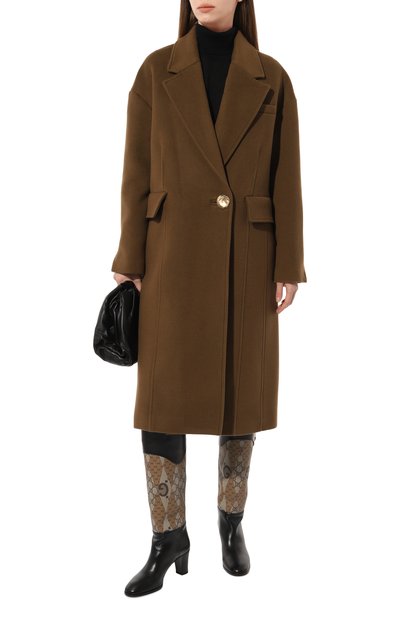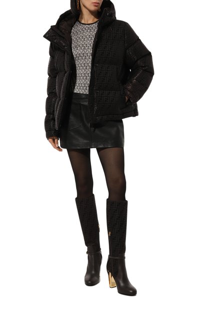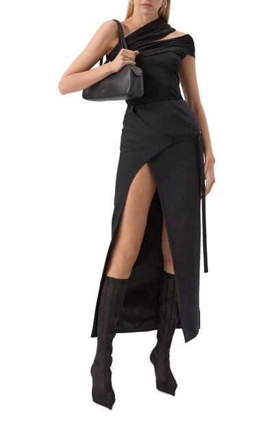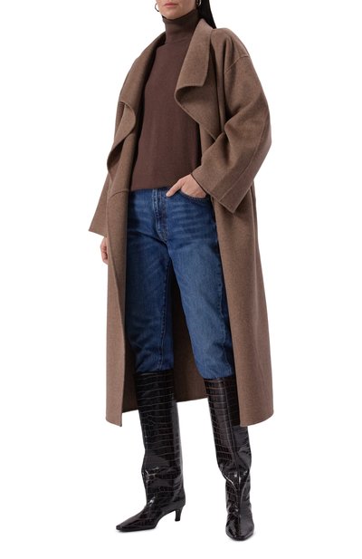Сапоги Tess выполнили из ворсистой козьей кожи с узором под телячью шкуру. Модель с зауженным мысом и широким голенищем установили на высокий обтяжной каблук.