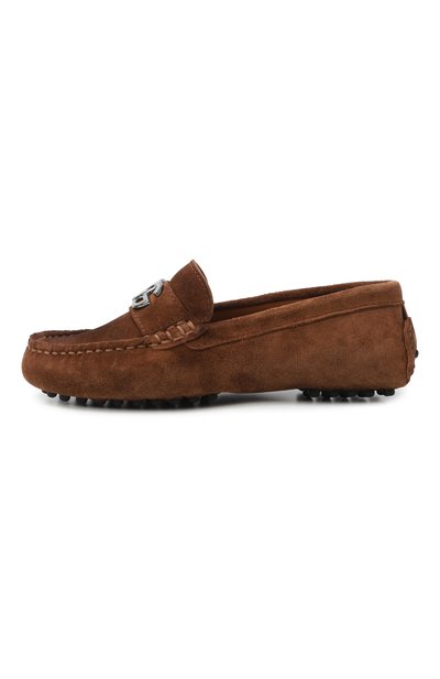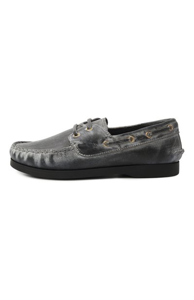 Мокасины на толстой резиновой подошве выполнили из коровьей кожи с декоративными потертостями. Модель с рельефными швами на мысе и заднике дополнили стичингом, которому вторит шнуровка.